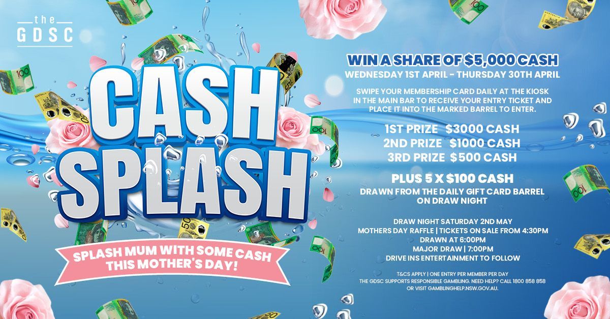 CASH SPLASH WEDNESDAY 1ST APRIL - THURSDAY 30TH APRIL | DRAWN SATURDAY 2ND MAY Splash Mum with some cash this Mother’s Day with Cash Splash at the GDSC, with your chance to win a share of $5,000 cash. Simply swipe your membership card daily at the kiosk in the Main Bar to receive your entry ticket, then place it into the marked barrel to go in the draw. One entry per member per day. Prizes include: 1st Prize: $3,000 Cash 2nd Prize: $1,000 Cash 3rd Prize: $500 Cash Plus, 5 x $100 cash prizes will also be drawn on the night from the Daily Members Gift Card barrel. Join us for the major draw on Saturday 2nd May at 7:00pm, alongside our Mother’s Day Raffle (tickets on sale from 4:30pm, drawn at 6:00pm), with entertainment by The Drive-Ins to follow. Don’t miss your chance to win, swipe daily and you could be one of our lucky winners. T&Cs apply | One entry per member per day | The GDSC supports responsible gambling | GambleAware gambleaware.nsw.gov.au | 1800 858 858