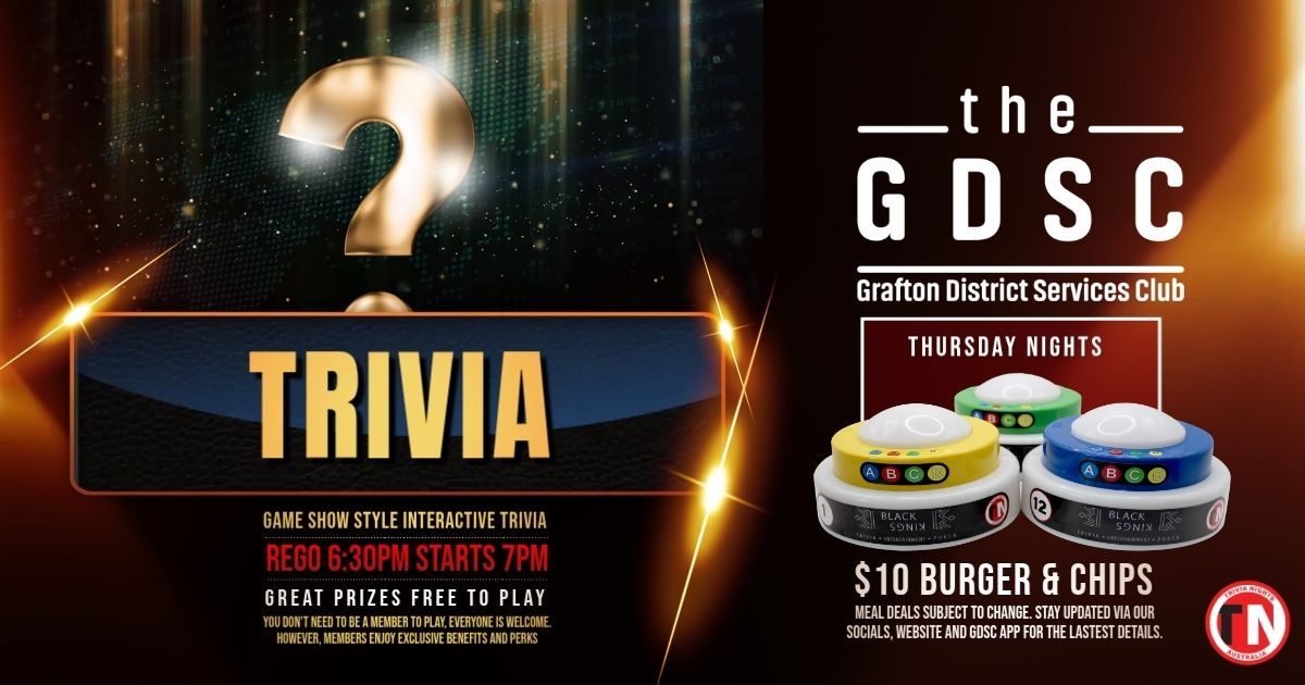 TRIVIA THURSDAY | REGISTRATION FROM 6:30PM | STARTS 7:00PM | FREE Put your knowledge to the test at the GDSC with our game show style interactive trivia , where quick thinking and teamwork are the key to taking home some great prizes. It’s free to play and packed with fun, making it the perfect excuse to get your crew together for a midweek night out. Enjoy a relaxed atmosphere, plenty of laughs and a bit of friendly competition, plus take advantage of our $10 burger and chips special while you play. You don’t need to be a member to join in everyone is welcome. So grab your team, lock in your table and get ready for a great night of trivia at your Club.