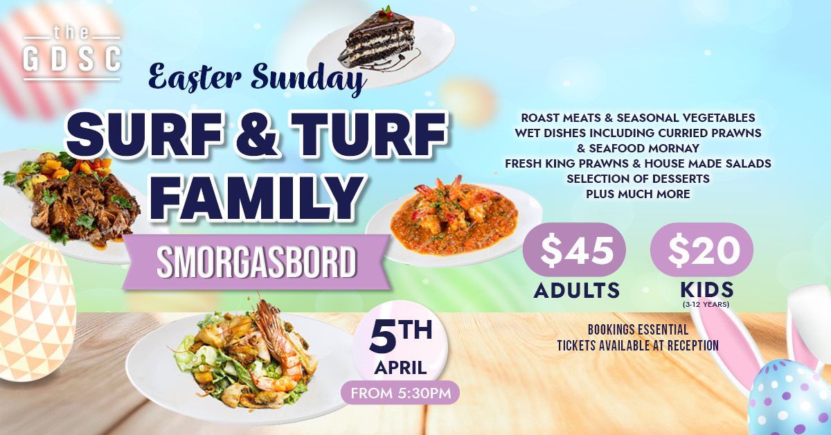 EASTER SUNDAY SMORGASBORD SUNDAY 5TH APRIL | FROM 5:30PM | ADULTS $45PP | KIDS $20 After the Easter eggs are gone and the chocolate rush has settled, gather the family at the GDSC for a relaxed evening with our Surf & Turf Family Smorgasbord and best of all, we’ll take care of the cooking and the clean up. Enjoy a generous spread featuring roast meats and seasonal vegetables, wet dishes including curried prawns and seafood mornay, fresh king prawns, house-made salads, and a selection of desserts, plus much more. It’s the perfect way to wind down the Easter weekend, enjoy great food and spend quality time with family and friends. Bookings essential. Tickets available from reception or call (02) 6640 3200