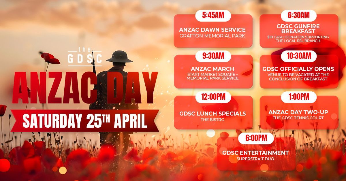 ANZAC DAY SATURDAY 25TH APRIL Join us as we come together to commemorate ANZAC Day, honouring the service and sacrifice of our veterans. The day begins with the Dawn Service at Grafton Memorial Park at 5:45am, followed by a Gunfire Breakfast at the GDSC from 6:30am with a $10 cash donation supporting the local RSL branch. The ANZAC March will commence at 9:30am , starting from Market Square and proceeding to Grafton Memorial Park for the commemorative service. The Club will reopen from 10:30am, with lunch specials available in The Bistro from 12:00pm. From 1:00pm, join us on the GDSC tennis court for Two-Up, continuing this ANZAC Day tradition. We’ll round out the day with live entertainment from 6:00pm, featuring Superstrait Duo. We invite members and guests to spend the day with us in remembrance, reflection and community..