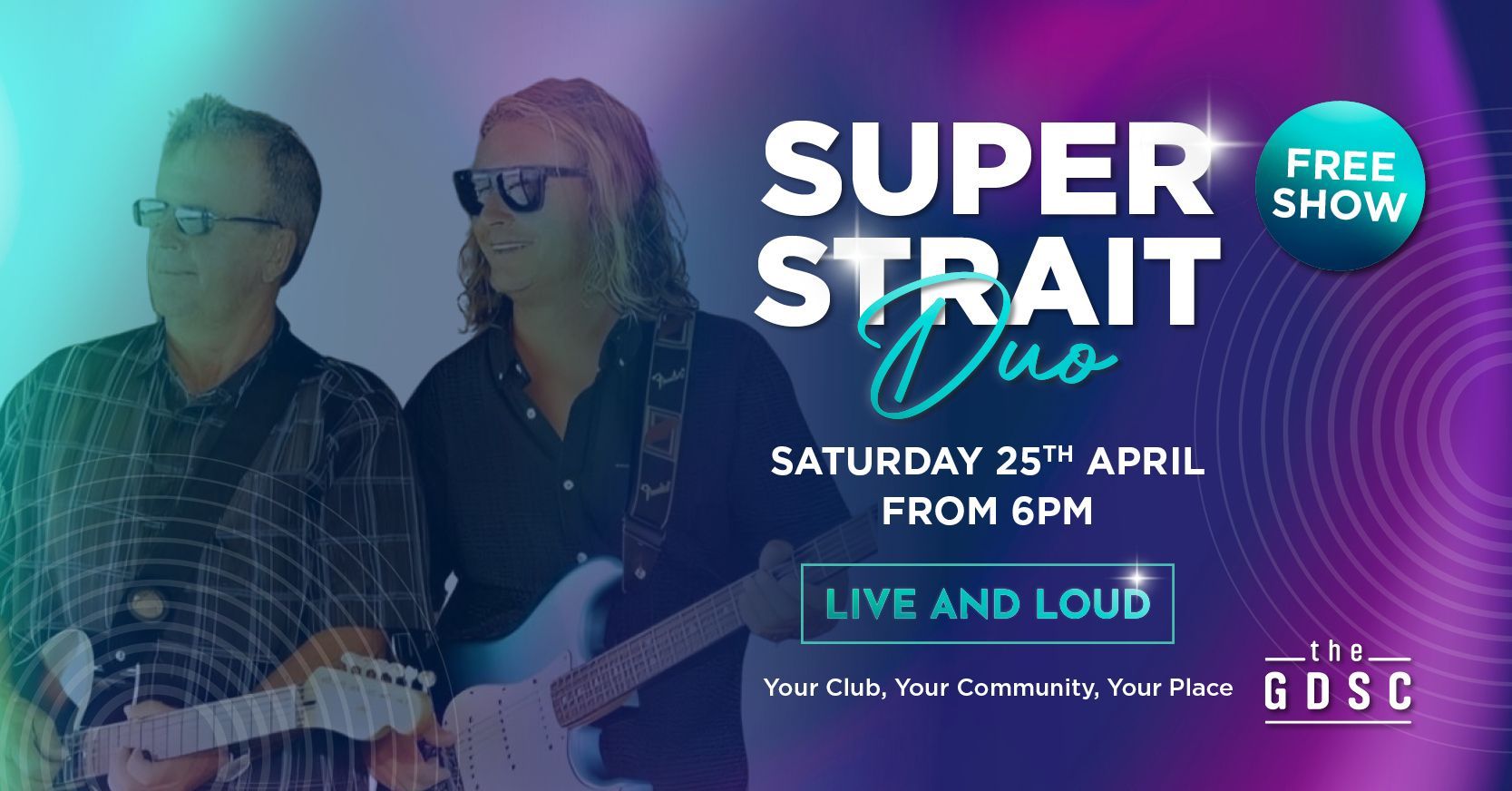 SUPERSTRAIT DUO SATURDAY 25TH APRIL | FROM 6:00PM | FREE Keep the good times rolling after 2UP and settle in for a great night of live music with Superstrait Duo. Bringing energy, passion and a sound that gets the room moving, Superstrait perform a mix of popular covers from the 70’s through to today, playing the rock you grew up with and keeping the dance floor alive. Featuring Dr Dave and Damo on guitars and vocals, backed by quality production, they deliver a full band experience that will have you staying on well into the night. Join us for a fun, feel good evening of live and loud entertainment at your Club.