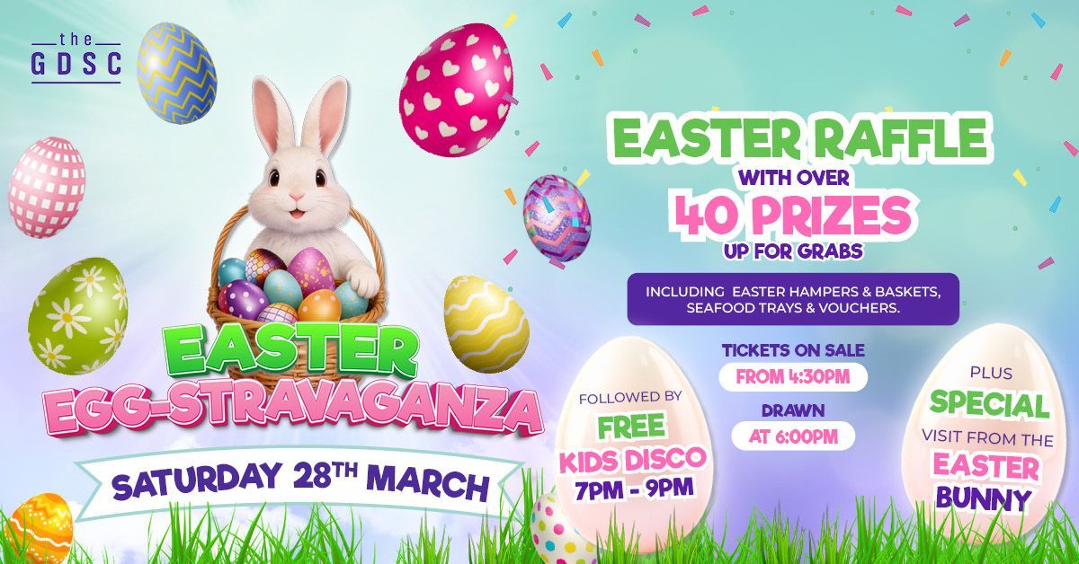 EASTER EGG-STRAVAGANZA SATURDAY 28TH MARCH | FROM 4:30PM Hop into the Easter spirit with the GDSC Easter Egg-stravaganza! There are over 40 fantastic prizes up for grabs in our Easter raffle, including Easter hampers, seafood trays and vouchers . Tickets go on sale from 4:30pm , with the raffle drawn at 6:00pm . The fun continues into the evening with a kids disco , packed with music, dancing and a few sneaky giveaways along the way. And of course, the night wouldn’t be complete without a special visit from the Easter Bunny . Bring the whole family along for a fun filled evening of Easter excitement at Your Club. The kids will have an unforgettable time dancing the night away, meeting the Easter Bunny and making a magical Easter memory!