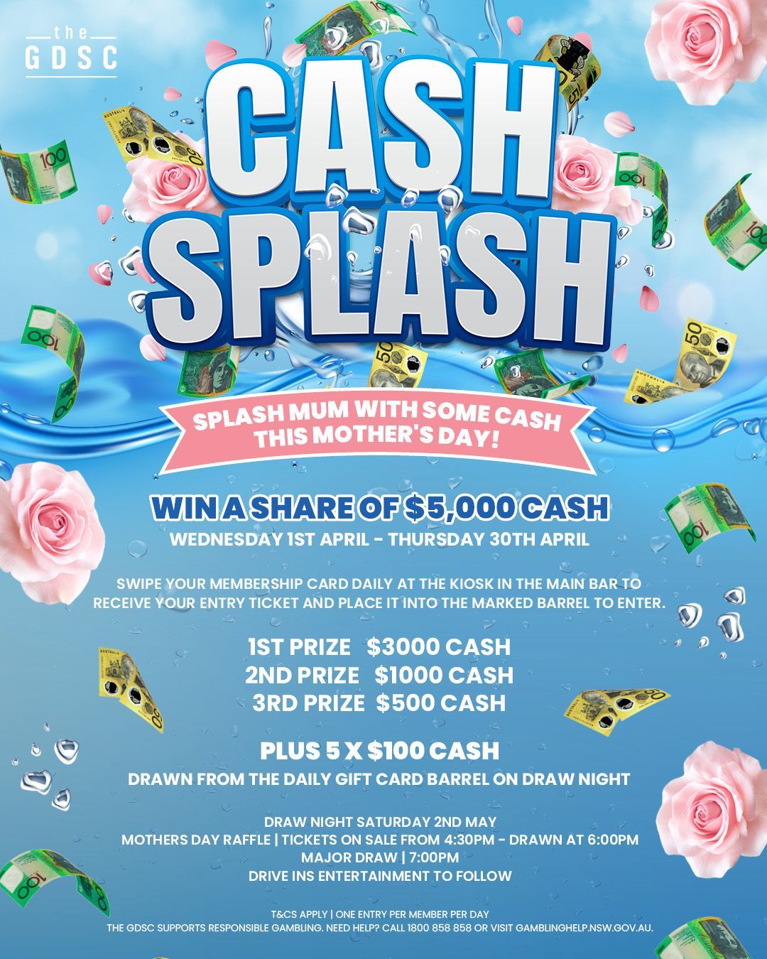 Splash Mum with some cash this Mother’s Day with Cash Splash at the GDSC, with your chance to win a share of $5,000 cash.