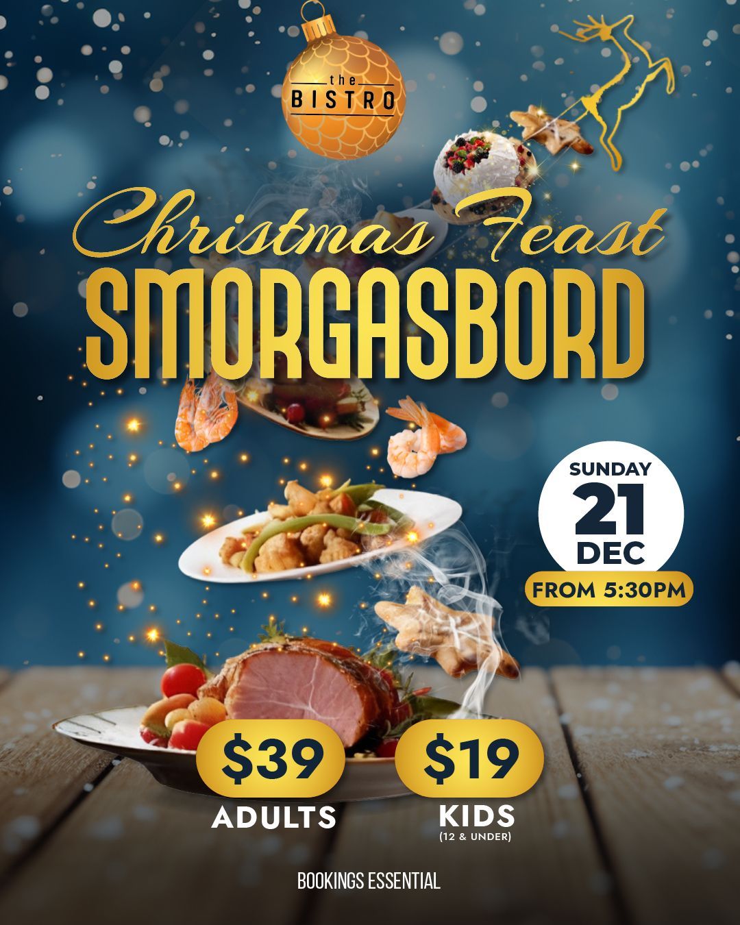 Gather your family and friends for a relaxed end of year catch up with our Christmas Feast Smorgasbord at the BISTRO. It’s the perfect way to get together before the Christmas and New Year rush, enjoy great food and good company, and leave the cooking and the cleaning to us.