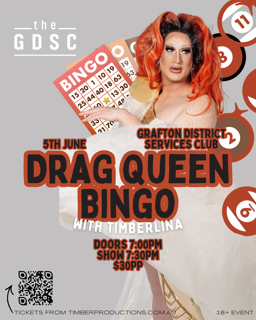 Get ready for an evening of glitz, glamour and giggles as Timberlina brings her fabulous Drag Bingo Extravaganza to the GDSC. With her over-the-top style, dazzling performances and quick-witted humour, Timberlina promises a night packed with laughs, sass and unforgettable entertainment.