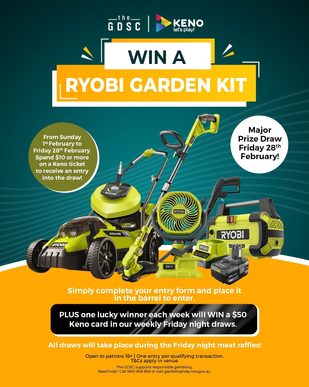 Play Keno at the GDSC this February for your chance to win a Ryobi Garden Kit, perfect for keeping your yard looking its best.