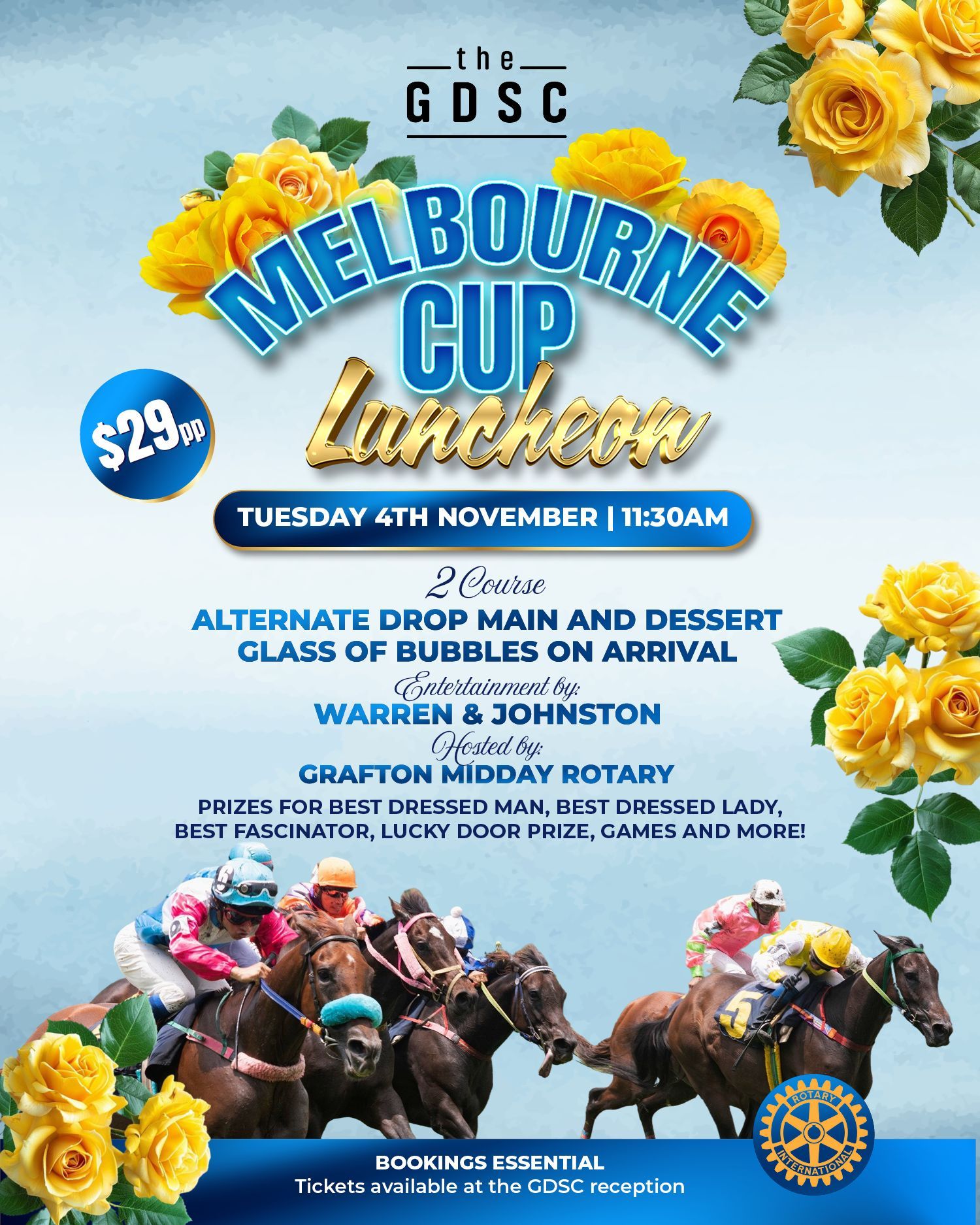 Tickets are just $29 per person and are available from the GDSC reception. Bookings are essential to secure your seat and be apart of an unforgettable Melbourne Cup celebration!