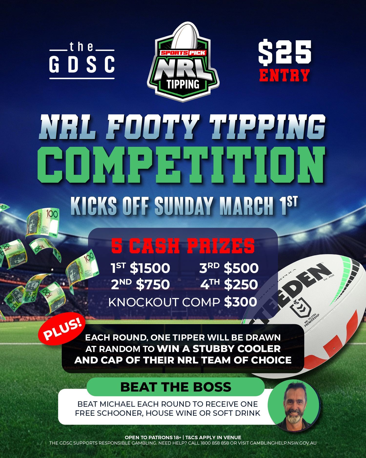 Think you know your footy? Put your tipping skills to the test in the GDSC’s NRL Footy Tipping Competition and compete for your share of $3,300 in 5 cash prizes.