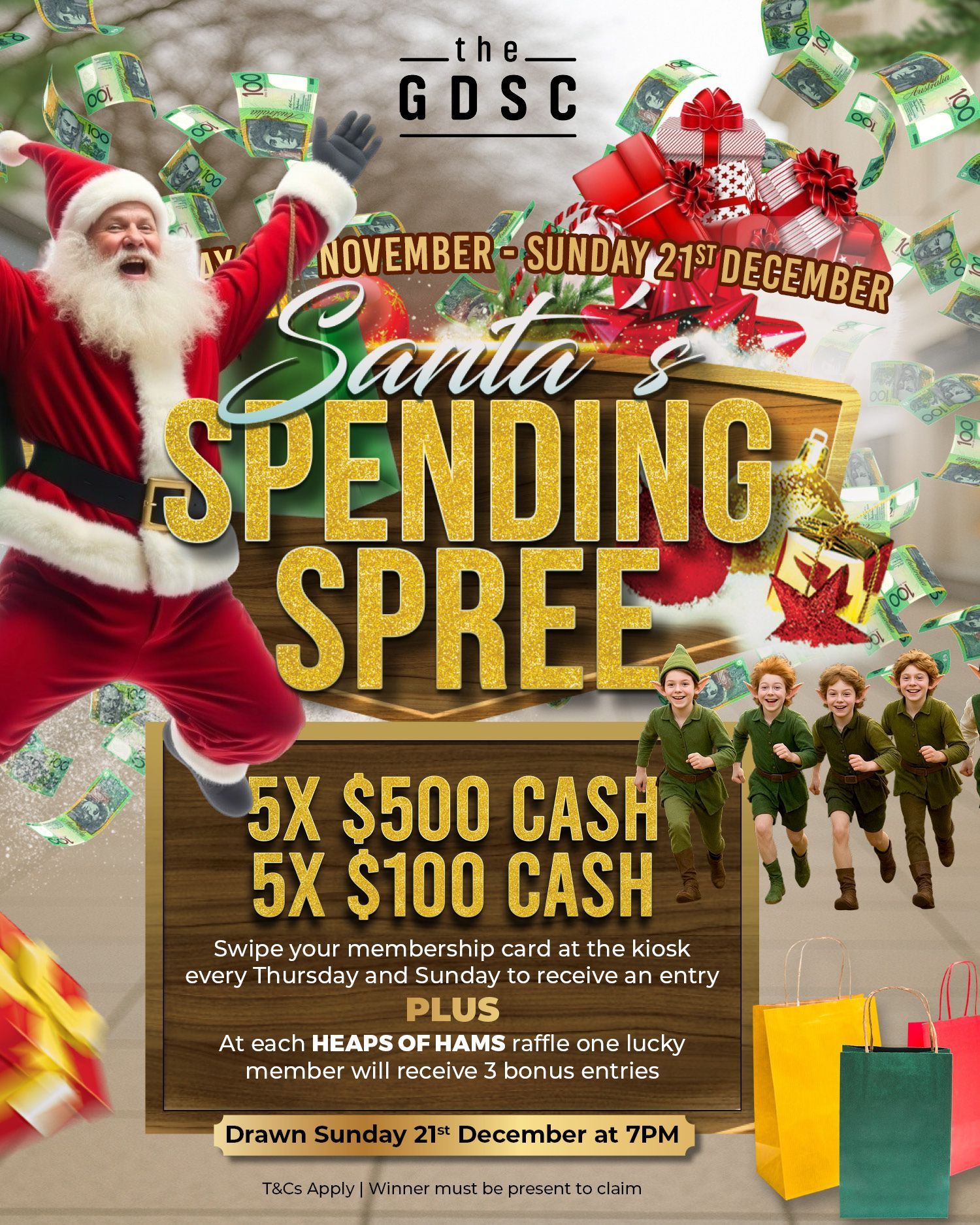 Who is ready for a festive cash giveaway at the GDSC with SANTAS SPENDING SPREE? Win a share of 5 x $500 cash and 5 x $100 cash, just in time for Christmas!