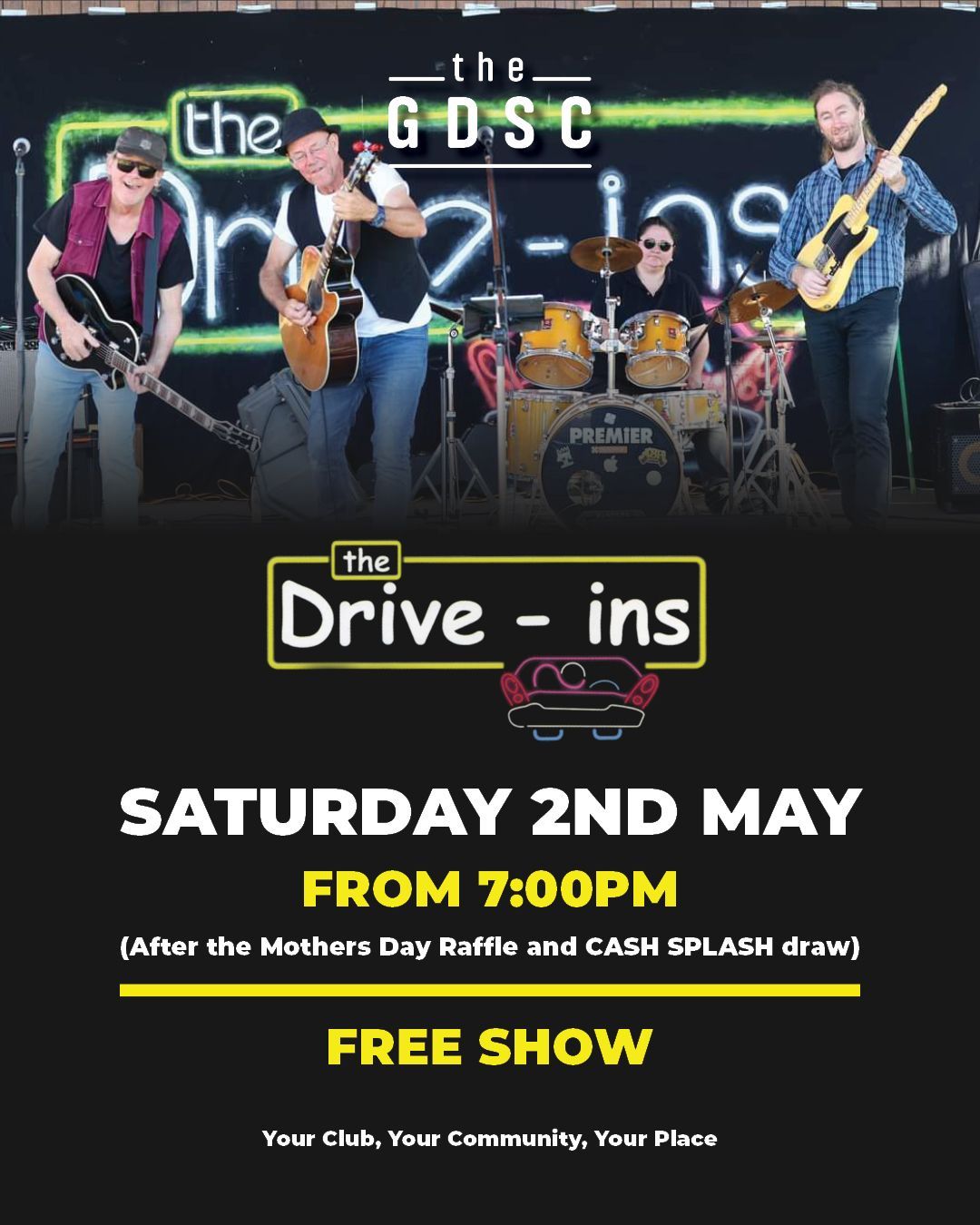 Keep the night going at the GDSC as The Drive-Ins hit the stage following our Mother’s Day Raffle and Cash Splash Major Draw.